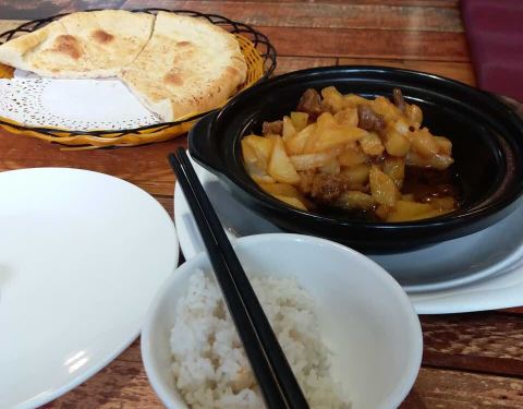 - ...多,2人行,点了一个饭,一个炒面,一个炒土豆丝,4串烤羊肉,2杯酸奶消费110多,算比较实惠吧