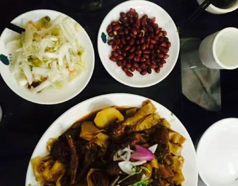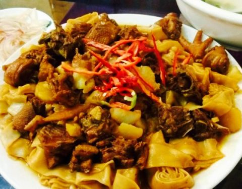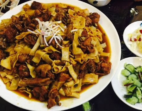 张掖的特色美食卷子鸡。跟大盘鸡很像。除了里面的卷子,这个卷子指的是卷起来的面皮。很有味儿,份量也是够够的。两个人吃小份的连一半都没吃掉。但老板说当地人一个人就可以吃掉一份小份,还要加,食量惊人啊。...
