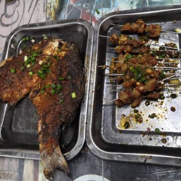 友人说这家的烧烤特别鲜美,为了来这家吃烧烤,开车跑了12公里,我想我们也是醉了。烧烤店在一个胡同里,里面有几家烧烤店铺,只有这家的生意非常好,虽然餐桌简陋,不过都坐满了。我们点了鱼,韭菜加烧烤串串,果然是味道非常爽口,不枉费我们跑那么远特意过来吃烧烤。