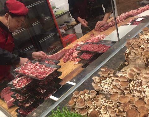 应该可以算的上是一个新鲜的牛肉铺吧,你点的肉,正在里面处理着,肥美的牛肉分成各种不相同的部位高高挂起