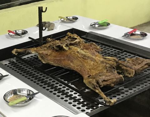河源万绿大道路边,接近东方国际酒店路口,停车场很大,提前预订2688元的烤全羊套餐,来自内蒙古的绵羊肉质鲜嫩,肥而不腻,大伙围着炉灶亲自割羊肉大块大块地吃吃吃。