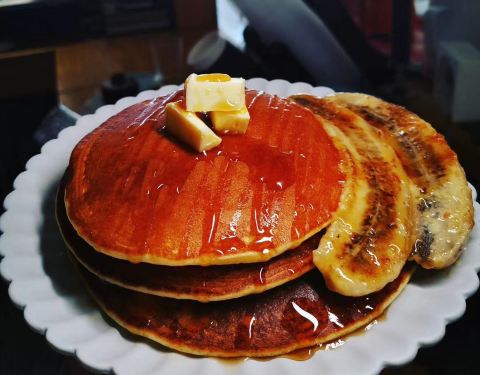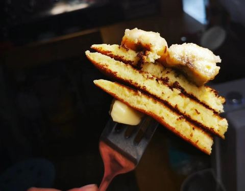 香蕉跟松饼简直绝配!可能是我饿了或者是太久没吃了。今晚T骨可以约了!