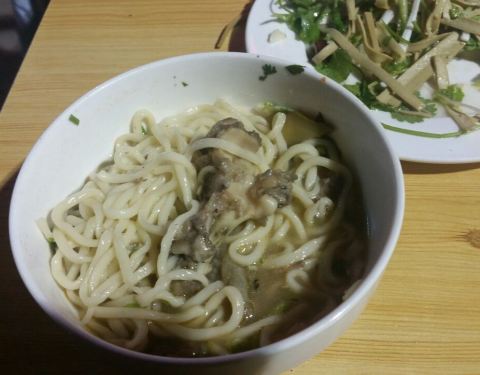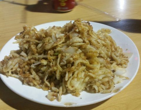 要了一个甘泉豆腐干、洋芋擦擦、羊肉面和烤羊肉串。甘泉豆腐干是当地名小吃,口感有点硬。洋芋擦擦就是土豆丝蒸熟了再炒一下(好像是这样),口感不错。羊肉面还可以,小份的就够了。