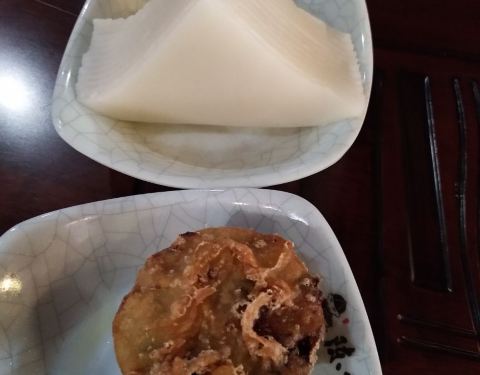掌柜家提供小吃也有面食,价位适中,选择比较多,图下是大份麻糍,煎豆角包和豆腐皮,味道都非常好