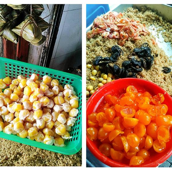 潮汕地区管粽子叫“棕球”,特点是一半甜一半咸,既有甜豆沙,也有咸味的虾干、冬菇、腊肠等材料。非端午的平时也容易买到