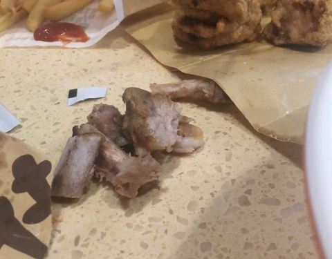 排骨里面带血丝。老板娘的解释也很简单,排骨太大,肉是熟的,里面骨头没有熟,如果等骨头熟了,肉就焦啦。如果你不建议,帮你把那个排骨再炸一下。我想说这个不是我不建议不建议,你拿出来售卖的东西再放到一锅油里,再炸。还是算了吧。