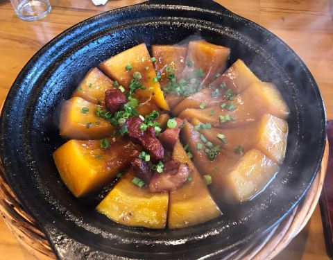 - 南瓜蒸的很好吃。猪肚汤放入很多生姜,有一点辣,东西很好。菜量大,口味不错。离和美酒店最近餐厅