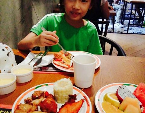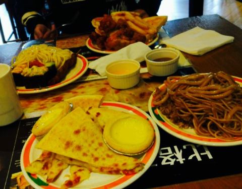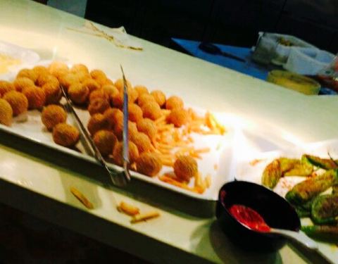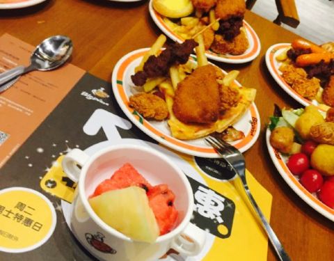以前在济南吃过,来日照玩就念念不忘也要吃一次,菜品比较少吧,不过也够吃了,人不多,非常好的是服务员把刚刚做好的榴莲披萨挨个桌子端着请大家尝尝,只是很多服务员围着聊天,夹菜的时候挡着我了也没说让开,我感觉服务员招多了,其它的都不错。