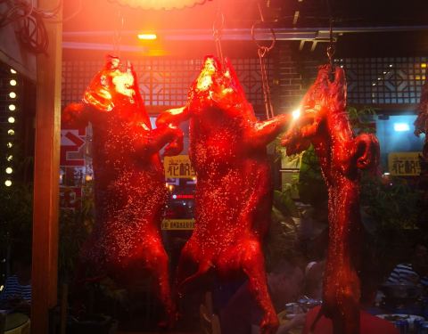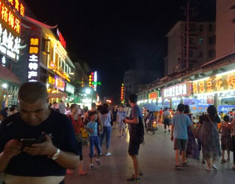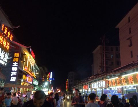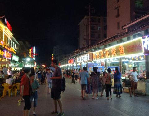 来到贵州荔波县漳江夜食小吃街,整条街道灯火辉煌,人来人往,每间食店都坐满了人,可见生意兴隆,火炭烧烤