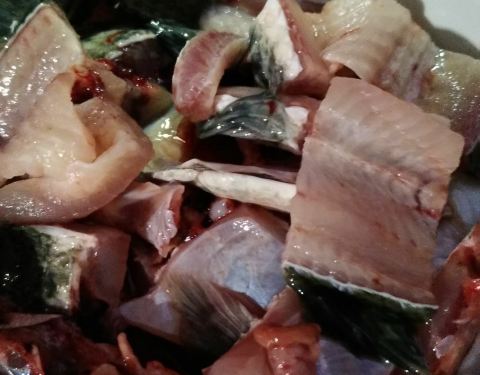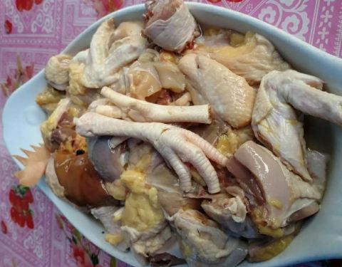 这里就是炖猪肚和鸡块。没滋味,必须配着调味料。~调味料也就是酱油,醋,小橘子,和蒜,辣椒。这个天气吃火锅,真的是高热啊。