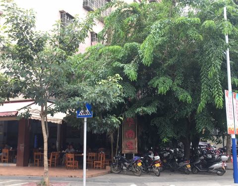 中午时分,店里很多旅客,电扇在头顶吱呀呀地转,都是阿姨们在招待客人。没有空调,外地来的人吃出一身热汗,本地人还逍遥自在。都是家常的味道,面汤里是方便面,捞河粉上配的大概是牛肉丝,红薯叶炒牛肉是妈妈和店员商量出来的,芋头叶18加牛肉12,大排档就是那么随性吧。店里有一种叫汉菜的青菜,以为是本地风味,端上来发现是我们的苋菜,回想起刚刚看到店员阿姨坐在大堂一角摘菜,现点现摘现做,也是搞笑。点心都是两块三块的,倒也公道。不管是红豆糕还是糯米糍都很黏,大夏天吃来未免不够清爽。