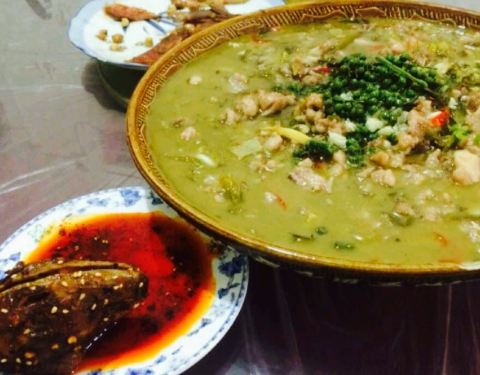 哑巴兔虽然辣得我跳脚,用的是青小米辣,鲜香,连续吃会让味觉丧失,最后还是没吃完,但是不否认它很好吃,带有泡椒的酸。泡椒兔就很醇和,酸辣刚刚好,一粒不剩。卤菜中上水平,酸菜面疙瘩至少有个八十分的水平,最最意外就是锅边馍馍连续点了三次,一人一个撑死了还要继续吃,内心酥软外皮稍许焦脆,是我喜欢甜的发酵面,给你们说,我都流口水了。