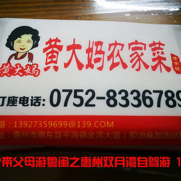 星期天去双月湾玩两天,晚上到的时候已经是用餐的时间,看出这家排挡就在路边,规模挺大,门口车位都停满了,感觉应该不错就进去尝试味道。进店第一感觉是排挡很卫生。找到老板点菜,老板娘说刚进货了一条野生龙趸鱼,资深广东吃货都知道此鱼难得,二话不说就点了,简单的清蒸就很入味。外加白灼野生小龙虾,海味很足,和养殖的有天壤之别。酱爆鱿鱼和顺德的做法不太一样,加入小洋葱一起炒带有一股鲜甜,很适合下酒。海胆炒饭分量很足,不腥不腻,喷香四溢,一上去就每人两碗分掉了。另外还点了杂鱼汤,粉丝蒸带子,味道很正宗,关键是够新鲜。饱餐一顿后一家人都很满意,到了酒店入住。第二天,由于前一晚的美味大餐,大家对双月湾海鲜排挡的印象不错,期待很高,于是中午就近在酒店隔壁找了一家网评很高的排挡继续尝鲜,结果失望。于是当天晚上决定还是回到黄大妈帮衬。离酒店虽然远了一点,但至少花了钱能吃到好东西啊。这次除了海鲜,还外加一只当地特色窑鸡,是她们自家养的鸡,鸡肉细嫩好吃,也很值得推荐。可以说在黄大妈吃饭是这次旅途最大的收获了,美味到菜都忘了拍,大家凑活看吧,良心推荐。