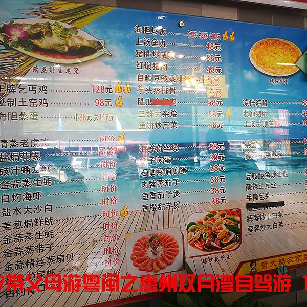 无意间路过这家店,就进来了。店里的汉子都在外面招呼车子进去就餐,女人主内负责接待。不知道接待我们的是不是黄大妈,挺热心的。因为老婆大肚子,他们还告诉我们有些海鲜不要吃,挺好的。点了窑鸡,皮皮虾,青菜,清新,做法就是农家菜做法。米是有点黄,我们农村出来的知道这个是自己打的米,没有抛光,青菜清甜,就是炒的时候油多了点。整体觉得不错,不像评价说的黑店。出来玩图个开心,要是实在吃到不行的菜或者有不满,当面和店主说吧,她们挺礼貌的。