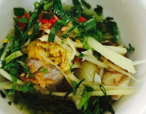 位置还真不好找 。来回走了两遍才发现 。不在主路上 。是第一个口子拐进去 。店面不大 。听说老板娘是越南人哦 。普通话说的还行。越南面包 。这个确实赞 。是法国长面包改进而来的 。里边放了鸡蛋 。肉末 。蔬菜等等 。虽然杂 。但组合在一起确有不错的味道 。外面的面包现炸过 。松脆可口 。是在东兴吃到的最好食物。屈头蛋 。 。东兴到处都有的小吃 。加了很多作料来去腥味 。吃了一个尝尝鲜 。虽然知道是用什么做的 。也没有太恶心 。但也没感觉多鲜美。鸡粉 。味道不错 。就是鸡肉是腌过得 。不新鲜。