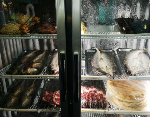 到了布尔津,就听导游说在这要做好吃饭被宰的准备。所以到幸福家园吃饭点菜前就做好斗智斗勇准备,不过老板还是很实在,每个菜都和我们讲好价格,菜肴都在冰柜现点,看起来还算公道。烤狗鱼不大,必点菜,口味偏咸,老板说这是他们特色,就这么重口味。烤羊肉串有3元和5元一串的,大小之区分。八个人吃了500元,还好没有太过分。