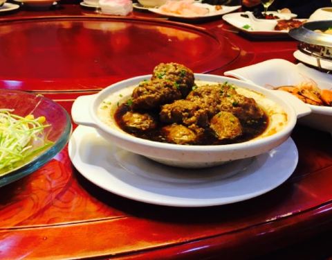 菜品也是十分的不错,实在记不清了随便举几个。大连鲍红烧肉,茶树菇炒牛柳,尤其是土灶铁锅菜饭很不错