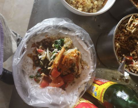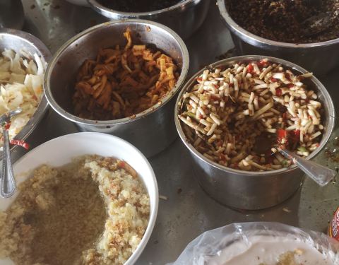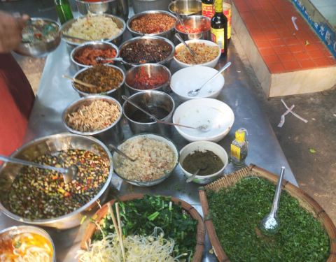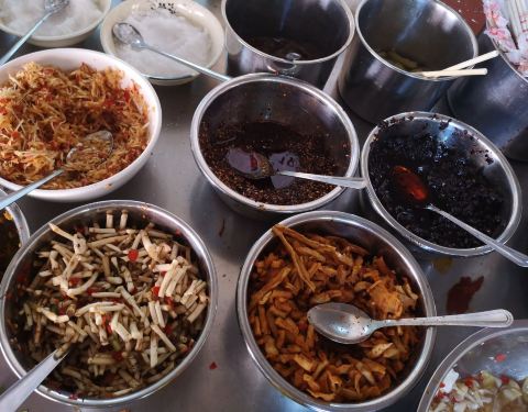 ...吃的是面条,那很棒,调料很多,是傣族的味道,景洪市的傣族味道是早点的一大特色,佐料多,非常好吃