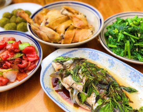 ...家里人一起吃,十分丰盛的一大桌菜,老板特地让我尝尝这里独特的酒糟大肠和绿茶沙雷,很有特点很爽口