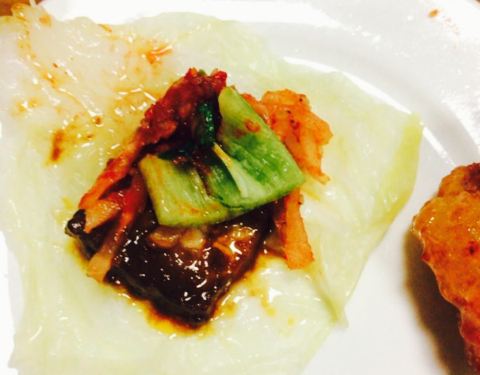 2017年回家第一天,第一顿饭在天仙包饭。周六中午人巨多,之后的都需要等位。#五花肉包饭#,肉肉肥瘦均匀,配了一大堆的蔬菜和两碗米饭,包饭酱很神奇,上桌的时候像一小碗汤,之后就变成酱,很浓稠了。美味。#明...