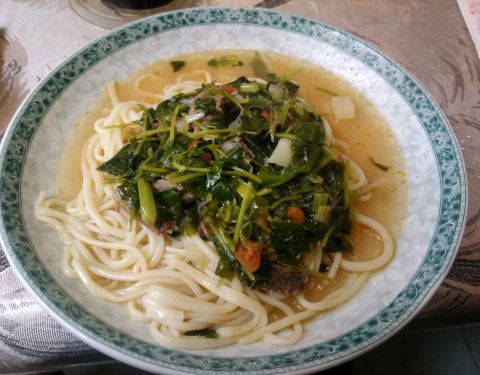 这里的拌面是用鸽子汤拌的,里面还有鸽子肉,拌面里的青菜是当地特有的,有一点点苦,非常好吃