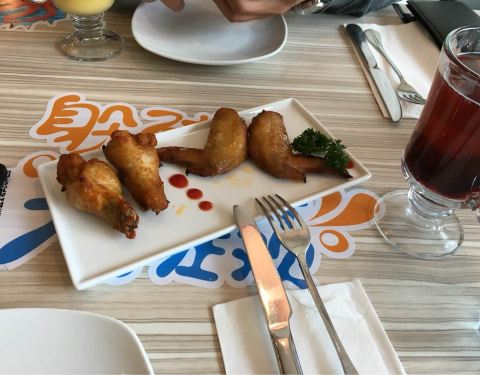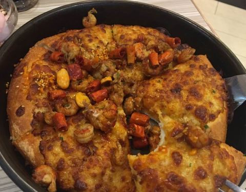 位置就在仆人一楼 交通便利 生意很好呢 人很多 我们三个人去没找到四人座位 等了一会才有四人座麻辣小龙虾披萨 还可以 但是为什么觉得双拼的超级至尊更好吃点 哈哈哈鸡翅 推荐!