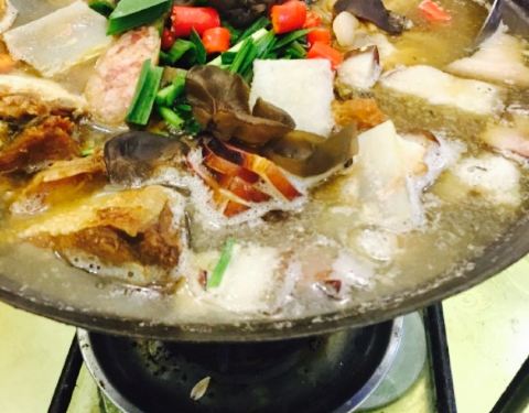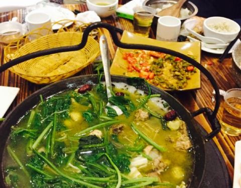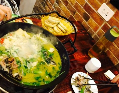 味道不错的一家吊锅,蒜香排骨很好吃,米酒很地道醇厚,鱼羊肉火锅的羊肉尽是骨头,鱼倒是有很大一个鱼头,味道偏咸,下酒不错,服务生热情,老板娘爽快,有一点要提意见的是火锅里配料有豆腐,服务员没有提示,我们又点了一盘豆腐,吃了两盘豆腐,??。