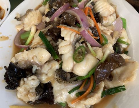 位置位于沙扒湾海边,有停车位置。海鲜的品种不少,价位在那边算是不错的选择,老板和一个大叔帮忙点菜,介绍我点了酱爆鱿鱼,蒜蓉粉丝蒸大贝,炒大肉蟹,蒸了一条红色的鱼(忘了叫什么名字了),加上青菜白饭300元。味道确实挺不错,海鲜很清新。很值得推荐哦。