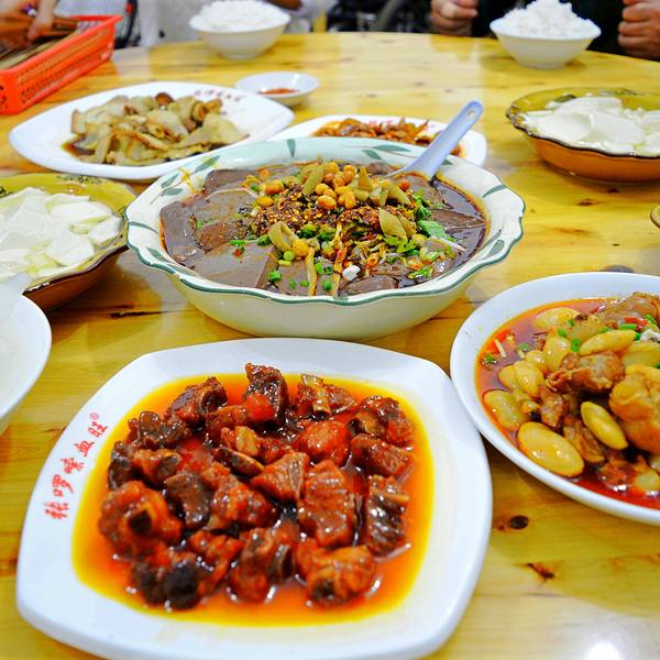 蒲江张啰嗦血旺,店面不大,可以说很普通,隐藏在蒲江县城一条名叫文庙街的横街上,但是名气真的很大很大,店里的招牌就是张啰唆,他家的特色主打菜就是血旺。血旺是川菜的名菜之一,也叫血豆腐,为动物血加盐直接加热凝固而成的食品,常见的血旺为鸭血、鸡血、猪血制作而来,他家主要以鸭血为制作主料,口味属于麻辣味。张啰嗦血旺是蒲江当地至上的美味。血旺咸淡适中,麻辣刚好,口感嫩滑,汁鲜油香……他家的血旺非常的嫩啊,油辣子也很香,里面加的萝卜丝丝脆脆的。我们还点了笋子烧牛肉,笋鲜肉嫩;糖醋排骨,小朋友们的必点菜,也不是很甜很油腻;土豆烧肥肠,也是川菜的经典搭配。这个店铺非常不显眼,但是生意火爆得难以想象。而且性价比真的超级高哦。