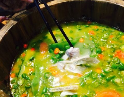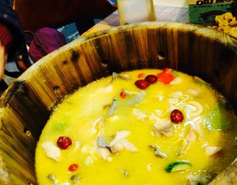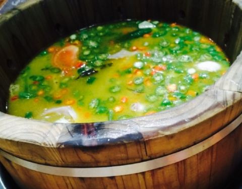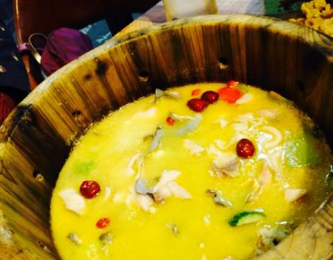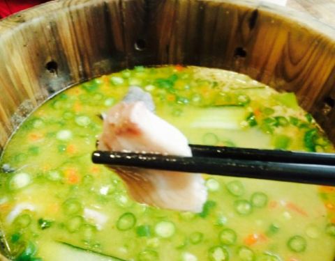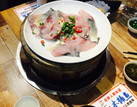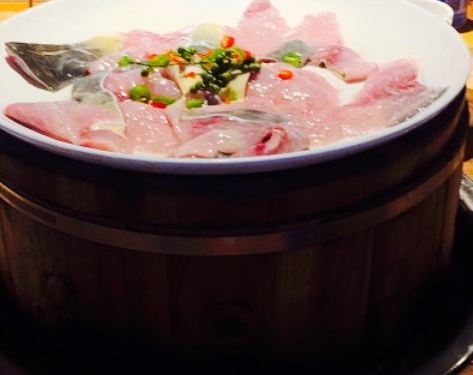 第一次吃裸斑鱼,攻略中奖特别高兴,平时喜欢吃鱼,赶到华阳迫不及待想看看木桶鱼是怎么回事。煮法好非常,把现杀好的鱼片放在有烧热滚烫的木桶里,在倒入熬制很久的高汤,刺啦一声,鱼香味在空气中飘散,鱼肉滑嫩可口,非常爽口,汤更鲜香,浓浓的加了配菜,喝汤吃菜更爽,我喝了好几碗汤都还意犹未尽,太爽口了。听服务生说这样煮出去的鱼营养很好,不会流失,在木桶里煮感觉很温馨,很巴适,超级开心。还会带家人去品尝。