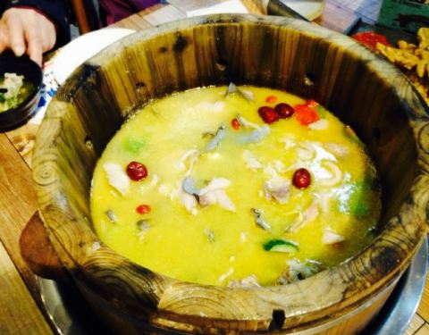 首先来说下地理位置,地理位置在华阳的一条街上。店招非常的大,所以特别好找到这家,一条街都是吃的。这家到7点都要排队,所以可见这家的生意特别不错。这家的生意不错,我想可能有几个原因,第一,诚实的店家。第二,分量真心的大。喜欢这家的特色木桶的最下面放的是石块,然后用来保温的,然后吃着鱼的时候还不会凉,这一点我感觉做的十分,亲切。这家的汤觉得十分的香,嗯,但是可能最后吃的化痰有一点咸,最近一在之前就先喝一点汤。