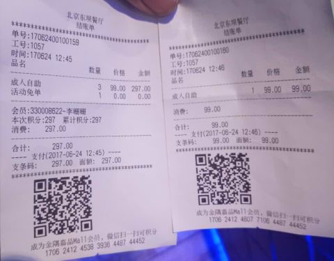 不过她也没说多少钱,我还挺高兴的就刷了,扣完钱我一看单据是99元/人算的,我说门口广告牌和东霸...