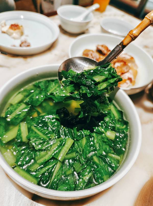 「鸡汤浸乡下苦麦」是非常地域化的绿叶菜,配上原汁原味的鸡汤,美味又养生~