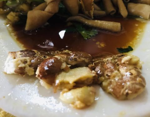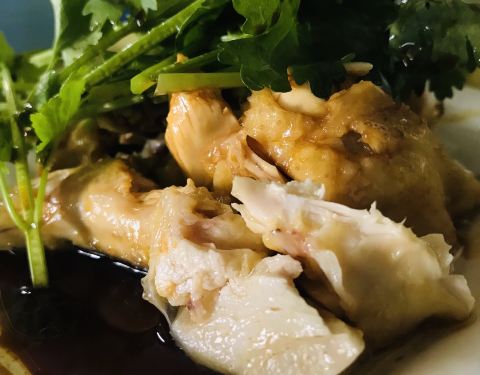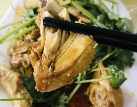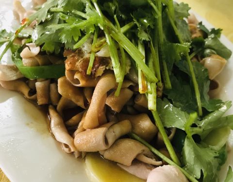 离地铁口很近,在这热炸天的天气里,这个距离要到极限了。 点菜就送鸭粥,里面有鸭血和一块鸭肝(不知道是不是误入的),粥的味道一般不是很鲜美。 白灼鸭肠好大一份35块,酱汁里加了芝麻油,鲜甜中带着浓郁的香。白切鸡一例28,一样的酱汁,大概是腿+翅,嫩特别是鸡翅上的皮,肥而不腻充满了胶质感。里面有大块拍碎的沙姜,有点药味,第一次吃,很特别的味道。