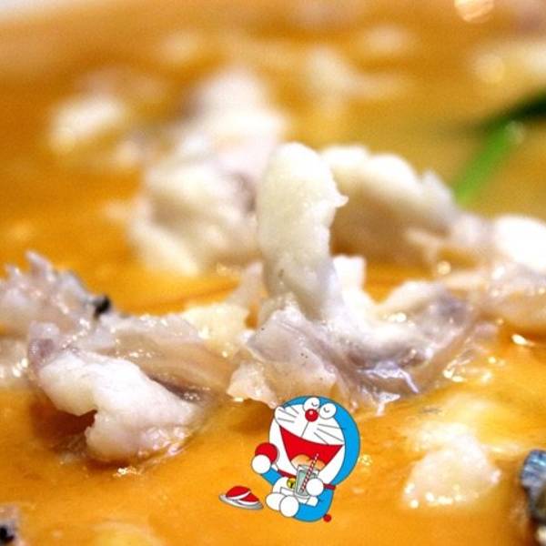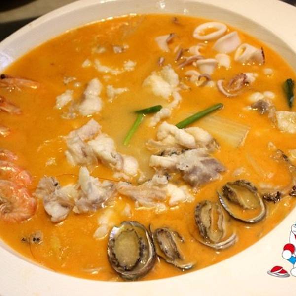 汤底是金黄的,虾膏汤底,味道挺香浓的,料十足,有鲜虾,鲍鱼,石斑鱼肉吃起来Q弹。
