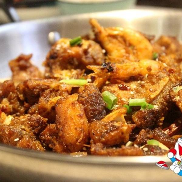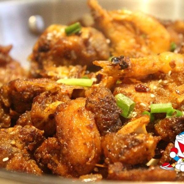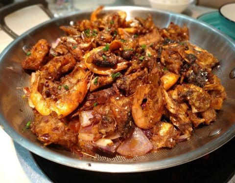 ...合无辣不欢的朋友,够入味,最爱里面的土豆片,美味,鱼头肉挺多的,吃起来很香, 还有虾,非常下饭