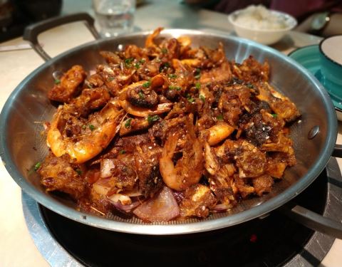 这道菜够辣,适合无辣不欢的朋友,够入味,最爱里面的土豆片,美味,鱼头肉挺多的,吃起来很香, 还有虾,非常下饭。