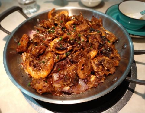 湖里万达广场三楼美食众多,而珑拾是一家以深海石斑鱼料理为主题的餐厅店面不是很大,但很有空间感,挺清新雅致的,很适合盆友聚会。 招牌淳鲜 分量十足,排盘大气。有大虾,鲍鱼、鱿鱼、鱼片等,各种海鲜精华汇集而成的汤头浓郁,香滑鲜美。鱼片也很嫩,大虾肉紧致清甜,果然是招牌。呵呵~ 火辣辣鱼头虾 配料丰富有大虾、鱼、土豆片等。非常辣香入味,鱼块口感很棒,很有胶质感,QQ的满满的胶原,咸香适中,下饭神器哦~ 闽南醋肉 外表金黄,外酥里嫩,肉质鲜甜,口感不错,酸甜可口。 清蒸鱼背鳍 摆盘很漂亮,清蒸后的鱼背鳍肉质,非常细腻肥美,原汁原味鲜甜。 星云 未喝已被高颜值惊艳到了,清新的小黄花在蓝紫渐变的水中翩翩起舞着,好梦幻啊。入口前奏清甜,再到后是微酸,口感很特别。