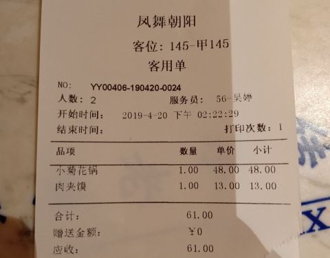 整体算是非常满意的一次美食体验。两个人应该够吃了。不管了。不过,全程没看到菊花,可能是菊花汤