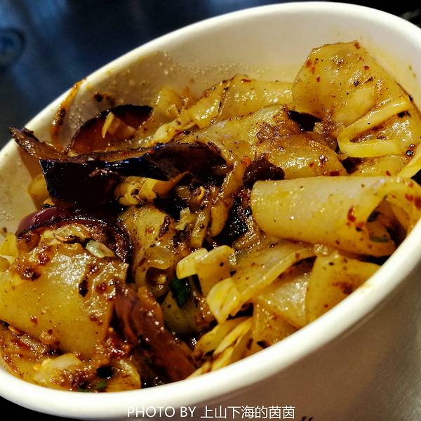 排队的时候就发现炒卷皮的被翻牌的次数颇高,基本上是每三个就有一个会下单。作为一个外地人,自然是要向本地人学习了!可能因为都是用米浆制作出来的,所以贵阳的卷皮和我们广州的米粉都是晶莹剔透、软糯筋道,不过和粤菜的清淡不同,思飨季将洋葱、辣椒面、酱汁和卷皮一同炒制,让原本平淡的卷皮沁入了浓浓的香气!【炸怪味洋芋】