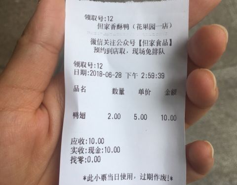 在花果园购物中心闲逛,在hm买了几件衣服后想休息一下,于是上点评搜搜有啥咖啡饮料店,突然发现但家香酥鸭,看了评论说是上过天天向上,而且口碑不错,于是就过来了。 因为不饿,所以就买了两份鸭翅,五元一份,...在花果园购物中心闲逛,在hm买了几件衣服后想休息一下,于是上点评搜搜有啥咖啡饮料店,突然发现但家香酥鸭,看了评论说是上过天天向上,而且口碑不错,于是就过来了。 因为不饿,所以就买了两份鸭翅,五元一份,一份两个,价格倒是不过,但是我觉得味道对我来说相对麻了一些,可能是期望太高,所以并没有觉得特别好吃
