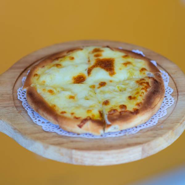 在明珠广场附近,有一座合口乐小吃城,这里汇聚了不少当地特色小吃,尝试了几家,感觉猫王榴莲披萨和一只酸牛奶都比较不错。披萨店并不大,以榴莲味为主打,大部分街坊喜欢在这里点外卖。披萨店单品众多,有巴西黑椒牛肉、黄金虾仁海鲜、咖喱鸡腿土豆、招牌奥尔良烤肉等口味,而最热门的莫过于香甜榴莲(金枕)和浓香榴莲榴莲(猫山王)这两款明星产品。跟其他大品牌的披萨店对比,或许餐饮环境达不到我的标准,但性价比还是比较高的,6寸单品20元起,12寸的88元起,也可以点套餐,单人套餐才38元,附送蛋挞一个和饮料一杯。出于对榴莲的钟爱,我点了一份6寸的猫山王榴莲披萨跟季叔叔一起享用。由于都是现买现烤的,所以都得等等十来分钟。披萨成品看上去比较单调,不像必胜客那样花巧,表面上就是一层米白色的芝士,但依然让人充满了食欲。 出于对榴莲的钟爱,我点了一份6寸的猫山王榴莲披萨跟季叔叔一起享用。由于都是现买现烤的,所以都得等等十来分钟。披萨成品看上去比较单调,不像必胜客那样花巧,表面上就是一层米白色的芝士,但依然让人充满了食欲。