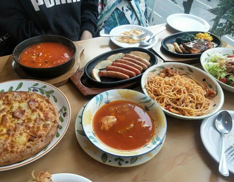 因为5.10号那天是我的生日哈哈哈哈,我的闺蜜来给我过生日,我闺蜜挑到了这家很好的店,一进门,就有一种香港茶餐厅的感觉,但是是意式餐厅,后来我们点了8个餐好像,除了泡菜汤不推荐,双拼烤肠的红色太辣,其他海鲜饭,披萨,鸡排,意面都很好吃,甜点还不错,一共才花了113元,所以性价比超高,推荐!