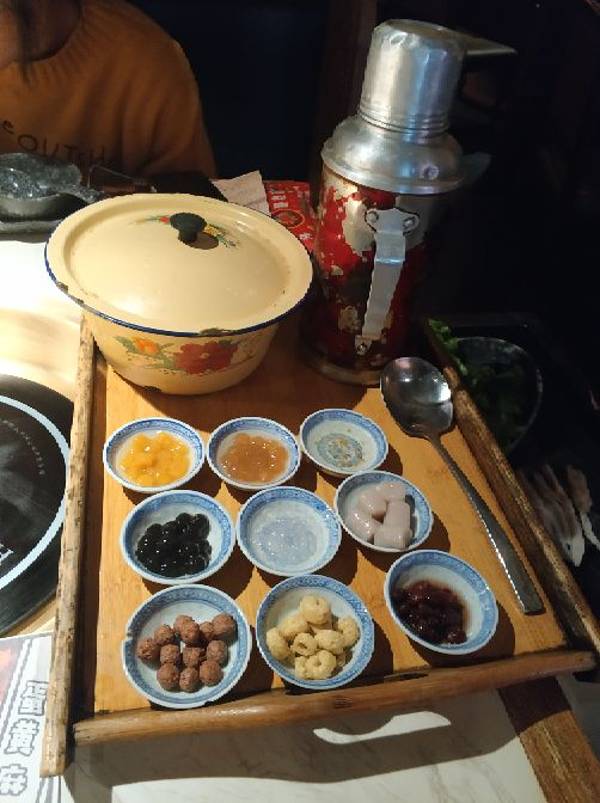 牛蛙真的超大超嫩 一人一只意犹未尽 又加点了一份 鹅肠黄喉毛肚水准都很不错 食材足够新鲜 茴香小油条会上瘾 直接吃也很香 火锅里稍微煮煮的口感又很不一样 干贝咸蛋虾滑 很弹也很鲜美 超大一颗非常实在[好爱哦] 薄脆的莴苣 吸汁的腐皮 煮完软糯的冬瓜 全都不能更满意了 红糖糍粑疯狂打Call!感觉自己一个人能吃一整份! 还有非常霸气的调理台 一整排目测20几种酱料 还有无限量的绿豆汤和酒酿圆子 虽然免费但是很好吃