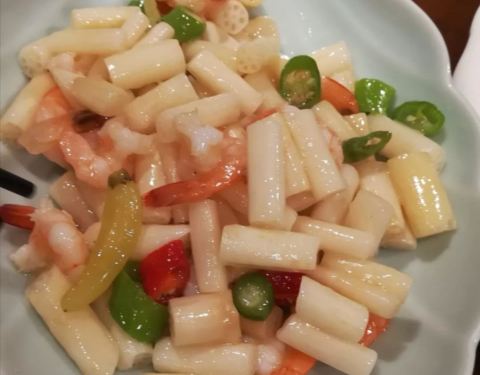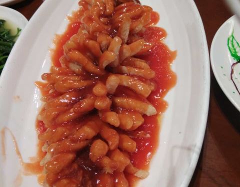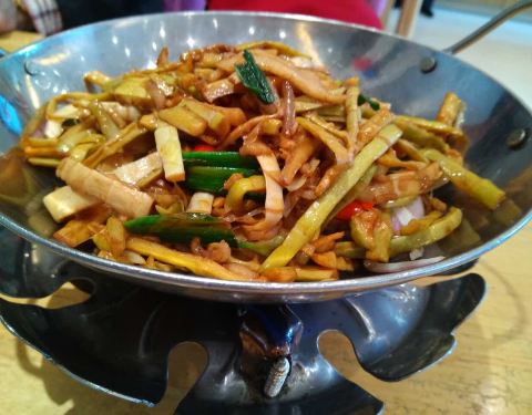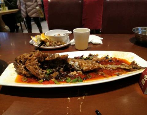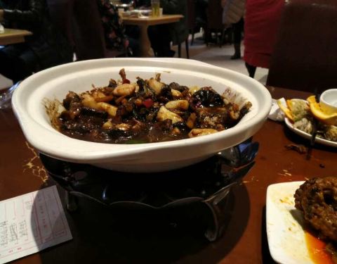松鼠皖鱼,口味酸酸甜甜,有点小刺,但是很好吃。重庆毛血旺,改良版,味道还不错,里面有猪血,虾尾,火腿,豆芽,味道不是很辣,属于刚好的那种。木盆黄瓜,吃起来味道正好,还挺不错的。其它的菜也挺不错。
