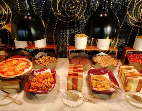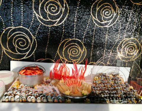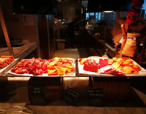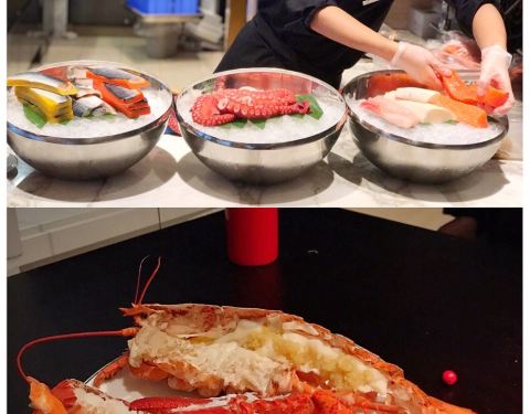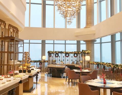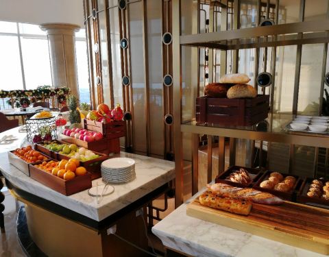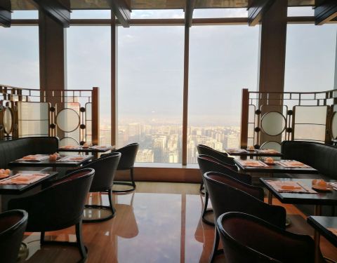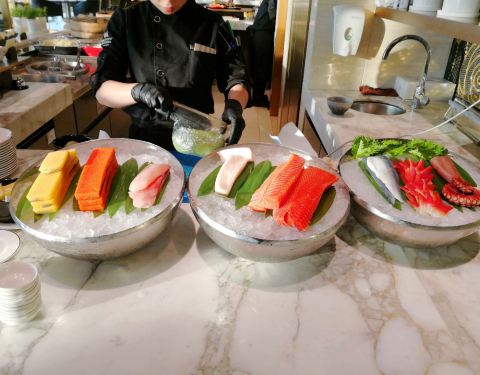 餐厅位于酒店的49层,宽敞明亮,视野开阔。餐厅提供种类多样的自助餐品,刺身、海鲜、甜品等应有尽有。为了保证出品口感,很多美味均为现做,口感极好。