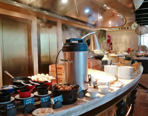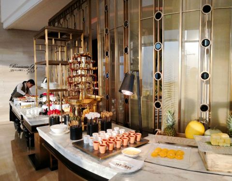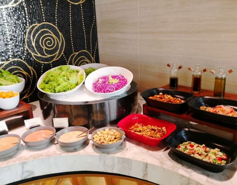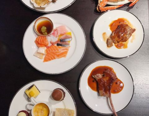 总评: 实话说,自助餐的种类是真的不多,但是品质是真的很好。 找准了吃,绝对物超所值! 说不上有什么是特别好吃,特别让我意犹未尽的,但是真的吃得很满足。 餐厅环境没话说,服务彬彬有礼但是不够周到细微,生意还可以。 建议提前预订靠窗位,晚上的夜景还蛮漂亮的哦! 评分:83分 性价比:❤❤❤❤ ☆重点 --- 自助餐是下午5:30开餐,建议这时候就该进场了。菜品开始陆陆续续摆放整齐了。看到喜欢的海鲜就多装点,因为到了后面也许就不会再补货了。 比如,大闸蟹这种大家都喜欢的品种。在6:10的时候就已经没有了。这后面来的客人基本上连面都没见到,真的替他们感觉难过。 其实开业初期,店里的海鲜无限量供应的是澳洲龙虾仔,真的是看到就很满足啦,可惜现在到店客人一人只能有半只了。 甜品水果区】 甜品台品种不多,但是款式看起来还可以。甜点包括了酒店招牌的几款红丝绒蛋糕,下午茶里单独买都是好几十一块的那种哦。 椰香芒果慕斯,这款蛋糕的外形和味道都不错,夹层很丰富,清新香甜,不甜腻; 红丝绒年轮卷,造型别致,但是稍微有点干;红丝绒巧克力球,特别浓郁,多吃会腻; 歌剧院真的太失败了,简直不是他们店该有的出品。 黑森林,一款有种少女童话般外形的黑森林蛋糕,口味嘛,有些差强人意了; 树莓蛋糕,看似简单而朴实的外表,其实吃起来还不错呢。 烤面包布丁,蛋奶香很浓郁,温温热还不错; 巧克力瀑布,吃了一个玛德琳的,普普通通。但是造型很漂亮哦。 冰淇淋是哈根达斯的。我记得之前的冰淇淋好像是自制的。尝了两款口味,草莓和奥利奥,我觉得还蛮好吃。 【海鲜和刺身区】 吃了很多的大闸蟹。都是蒸好了放在冰上的,吃的时候其实还是温温热的,蟹黄吃到爽! 刺身有好几款,比如三文鱼啊、希鲮鱼啊、八爪鱼啊、金枪鱼等等。品种还不错,比较鲜嫩。 【热菜及烤物】 热菜品种不多有一个脆脆的鸡块儿挺好吃的,像是避风塘做法,没看见名字; 其他的什么炒面啊、牛仔骨啊、炒饭啊、黑椒鸡翅等等,都比较普通。 蒜蓉烤扇贝、芝士焗生蚝这两种比较受欢迎,很多人夹。 【现点现做区】 第一次在自助餐里吃到好吃的牛排,他们煎的牛排真的很嫩呢,比好多餐厅好。 建议您来一碗担担面,让厨师少下点面,自己多加点肉臊子,那个味道真的还不错,面条有嚼劲,有很香,有点葱油的感觉。还有花生碎的脆口。