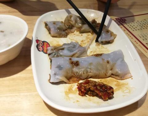 特别推荐三丝肠粉和牛肉粥。三丝肠粉的三丝是韭黄丝、红萝卜丝、冬菇丝做,非常新鲜