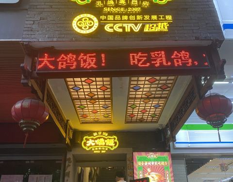 吃乳鸽最出名的是广东省的中山石岐,做法以红烧最为美味,皮脆肉嫩,非常惹味!在广州也有很多专门吃乳鸽的地方,最为出名的连锁品牌是【大鸽饭】,分店很多,其中一家动物园分店就在动物园c出口出来直走看到华辉拉肠,旁边就是,门口有点小,晚上6点多去到就要排队,人气非常旺,不过上菜速度快,而且味道不错,像椰子炖鸽子,椰子味非常浓郁,汤也很浓,红烧乳鸽皮非常脆,盐焗乳鸽味道入味,就是烤鸽肾吃起来有点咸,整体来说非常不错,免费开卡可以领一杯清热饮品!