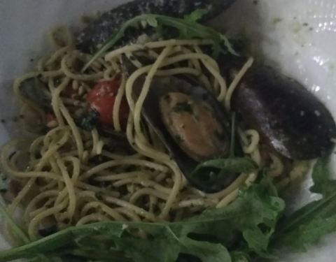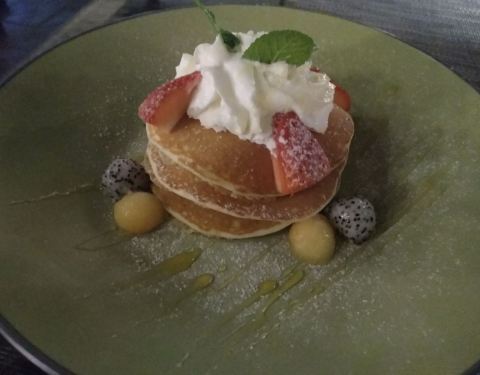 YES coffee garden好洋气的店名,位于大朗镇长育路旁边,长塘小学路口进去大约400米,晚上的话,流光溢彩的外观还是比较显眼的,不难找。 YES coffee garden整体来看,就是一栋独立的有内部庭院的两层别墅。在灯光色彩,各类植物的装饰下,还是比较好看。晚上有歌手驻唱,都是一些俊男靓女啊。 点了清贝意大利面,美食松饼配枫叶糖浆。当意大利面端上来的时候,惊呆了,这碗好大,大的可能叫碗已经不太合适了。有几只青贝,一些绿色蔬菜,红色的番茄,加上面条的颜色,这色彩斑斓,口感还可以,分量单看分量可能比较小,不过后面还有松饼。这松饼批戴着小蛋糕的头冠,覆盖看得见的草莓与奶油,颜值还不错的,味道还可以,松饼比较软。